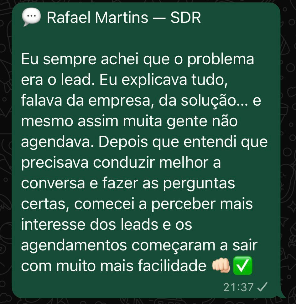 Foi observando essas conversas e treinando equipes comerciais que desenvolvi uma estrutura simples, baseada em 4 pilares, que ajudam SDRs a conduzir melhor suas conversas e transformar leads em agendamentos com muito mais consistência.